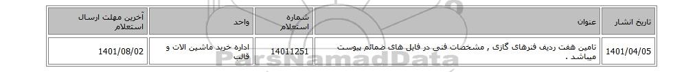 | 1401/04/05 | تامین هفت ردیف فنرهای گازی , مشخصات فنی در فایل های ضمائم پیوست میباشد . | 14011251 | اداره خرید ماشین الات و قالب | 1401/08/02 |