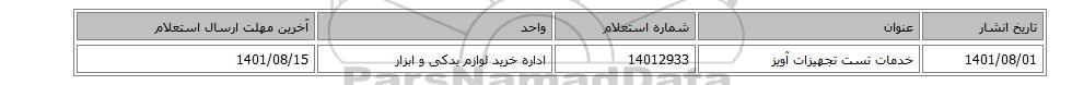 1401/08/01خدمات تست تجهیزات‎ آویز‏14012933اداره خرید لوازم یدکی و ابزار1401/08/15