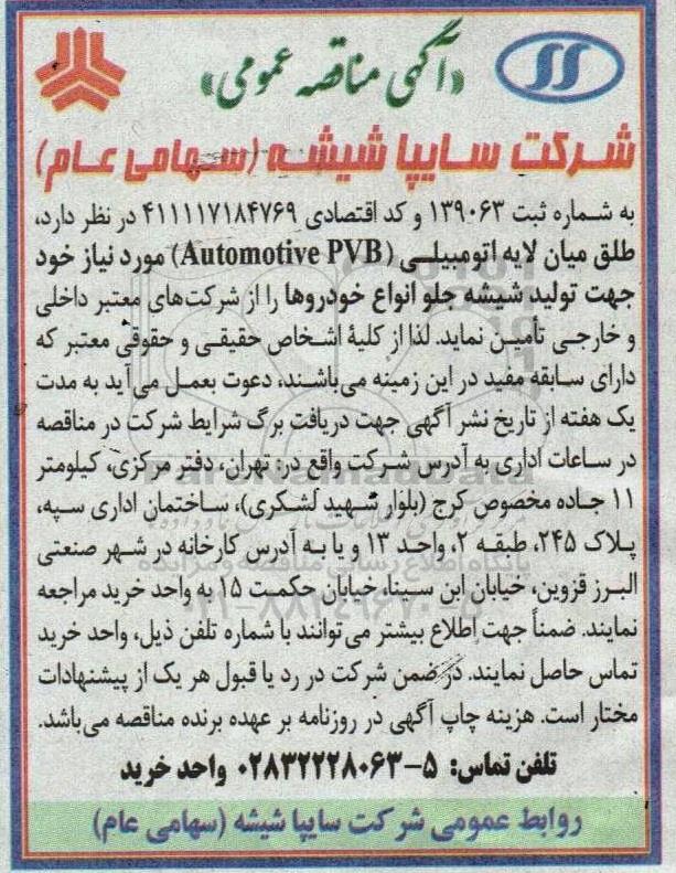 شرکت سایپا شیشه (سهامی عام) به شماره ثبت 139063 و کد اقتصادی 411117184769 در نظر دارد طلق میان لایه اتومبیلی (Automotive PVB) مورد نیاز خود جهت تولید شیشه جلو انواع خودروها را از شرکت های معتبر داخلی و خارجی تامین نماید.