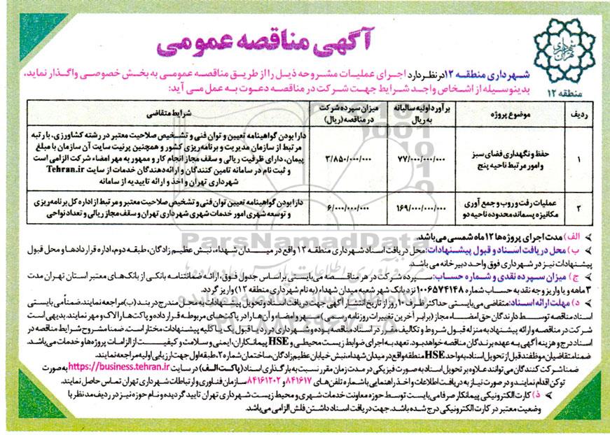 شهرداری منطقه 12 در نظر دارد اجرای عملیات مشروحه ذیل را از طریق مناقصه عمومی به بخش خصوصی واگذار نماید، بدینوسیله از اشخاص حقوقی واجد شرایط جهت شرکت در مناقصه دعوت به عمل می آید: