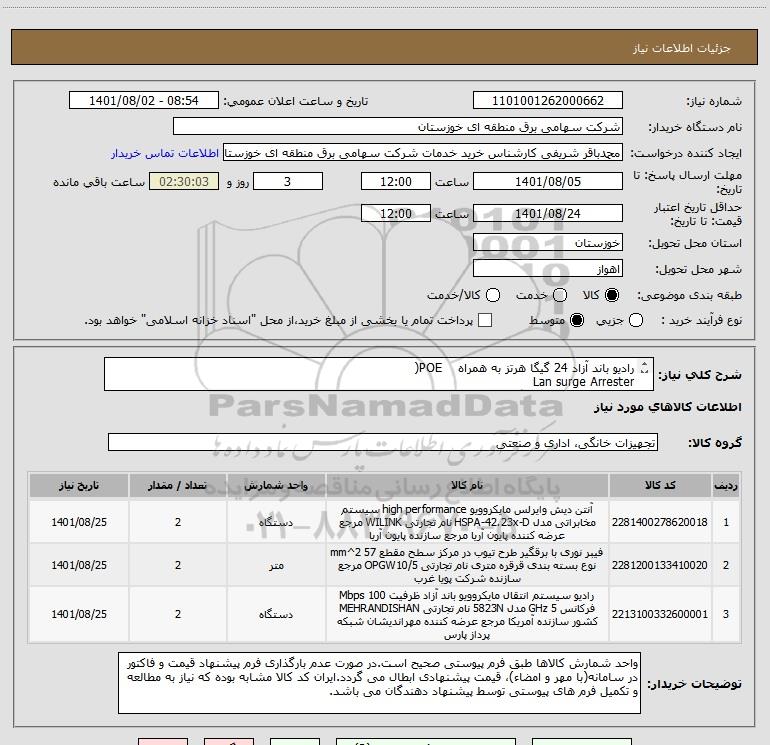 شرح کلی نیاز: رادیو باند آزاد 24 گیگا هرتز به همراه POE( Lan surge Arrester دیش رادیو مایکروویو با گین 42dbi