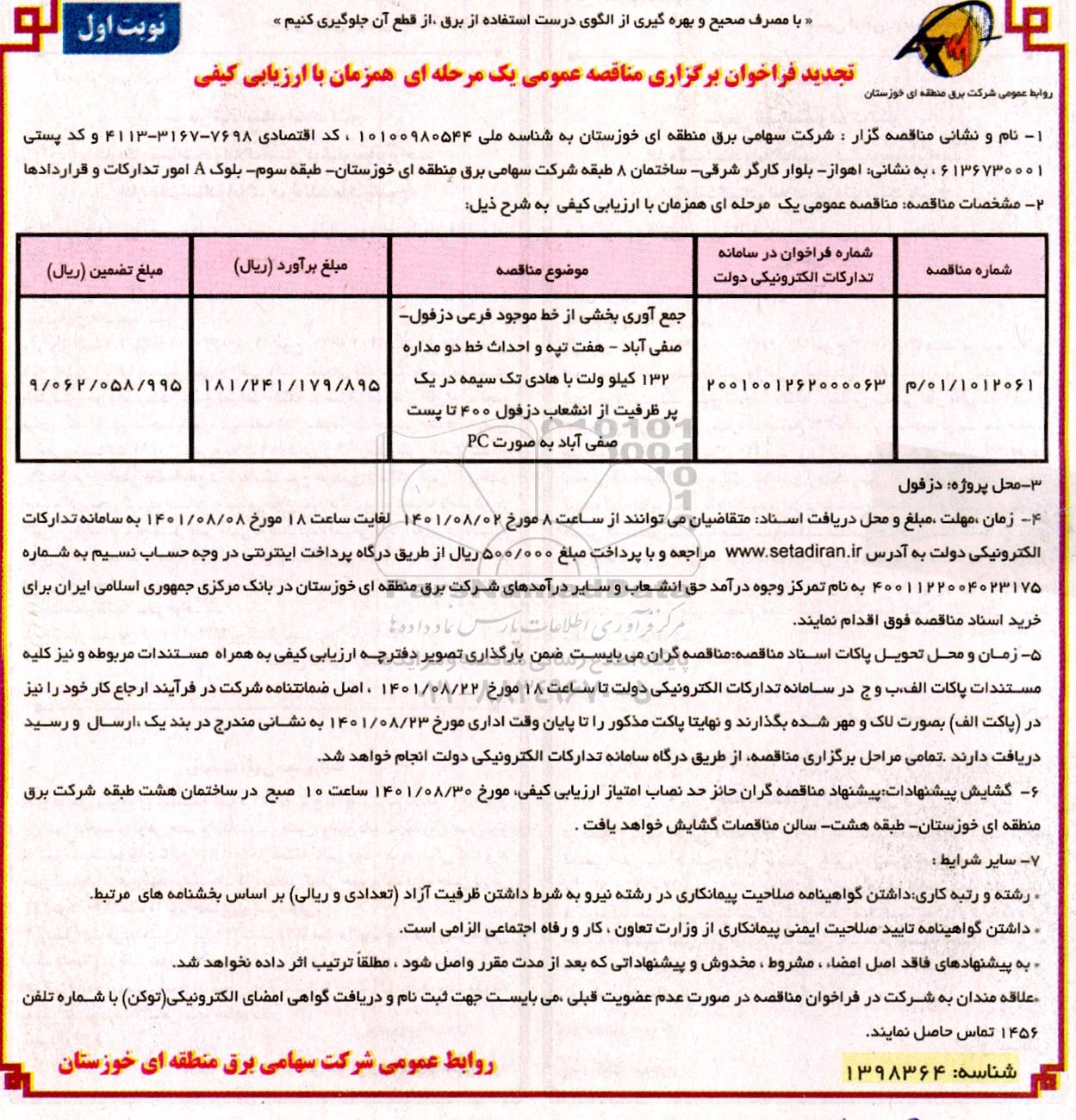| 1012061/01/م | 2001001262000063 | جمع آوری بخشی از خط موجود فرعی دزفول-صفی آباد-هفت تپه واحداث خط دومداره 132کیلوولت با هادی تکسیمه دریک پر ظرفیت از انشعاب دزفول 400 تا پست صفی اباد به صورت (PC) | 181.241.179.895 | 9.062.058.995 |