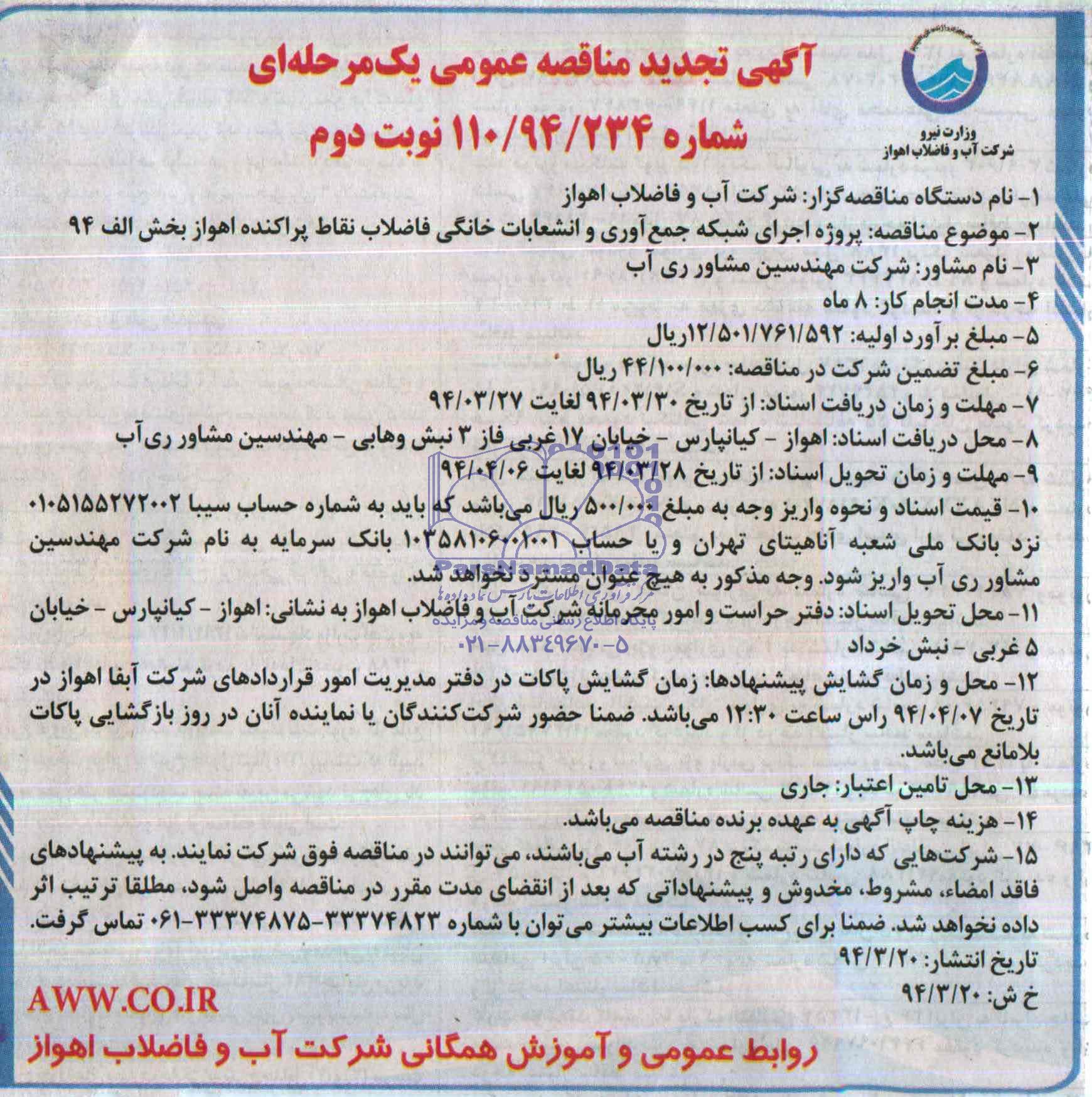 محل و زمان گشایش پیشنهادها: زمان گشایش پاکات در دفتر مدیریت قراردادهای شرکت آبفای اهواز در تاریخ 94.04.07 رأس ساعت 12:30 می باشد. ضمناً حضور شرکت کنندگان یا نماینده آنان در روز بازگشایی پاکات بلامانع می باشد. مناقصه در نوبت اول حداقل 3 شرکت کننده قابل بازگشایی خواهد بود