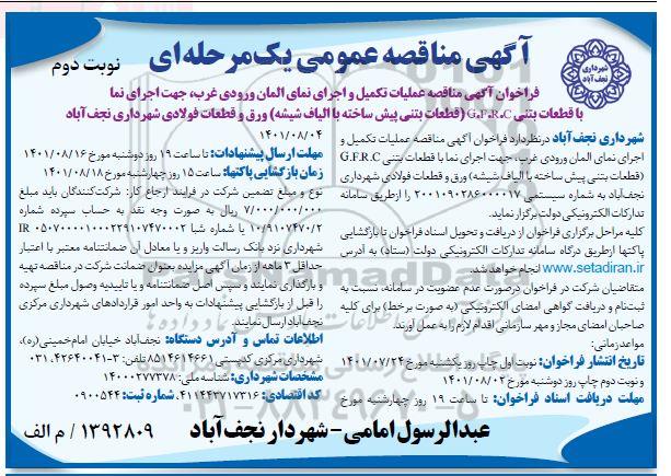 شهرداری نجف آباد در نظر دراد فراخوان آگهی مناقصه عملیات تکمیل و اجرای نمای المان ورودی غرب، جهت اجرای نما با قطعات بتنی G.F.R.C (قطعات بتنی پیش ساخته با الیاف شیشه) ورق و قطعات فولادی شهرداری نجف آباد به شماره سیستمی 2001090286000017 را از طریق سامانه تدارکات الکترونیکی دولت برگزار نماید. کلیه مراحل برگزاری فراخوان از دریافت و تحویل اسناد فراخوان تا بازگشایی پاکت ها از طریق درگاه سامانه تدارکات اکلترونیکی دولت ستاد به آدرس ستاد ایران انجام خواهد شد متقاضیان شرکت در فراخوان در صورت عدم عضویت در سامانه نسبت به ثبت نام و دریافت گواهی امضای الکترونیکی به صورت برخط برای کلیه صاحبان امضای مجاز و مهر سازمانی اقدام لازم را به عمل آورند
