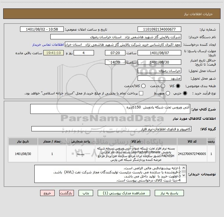 نام دستگاه خریدار:شرکت پالایش گاز شهید هاشمی نژاد استان خراسان رضوی
