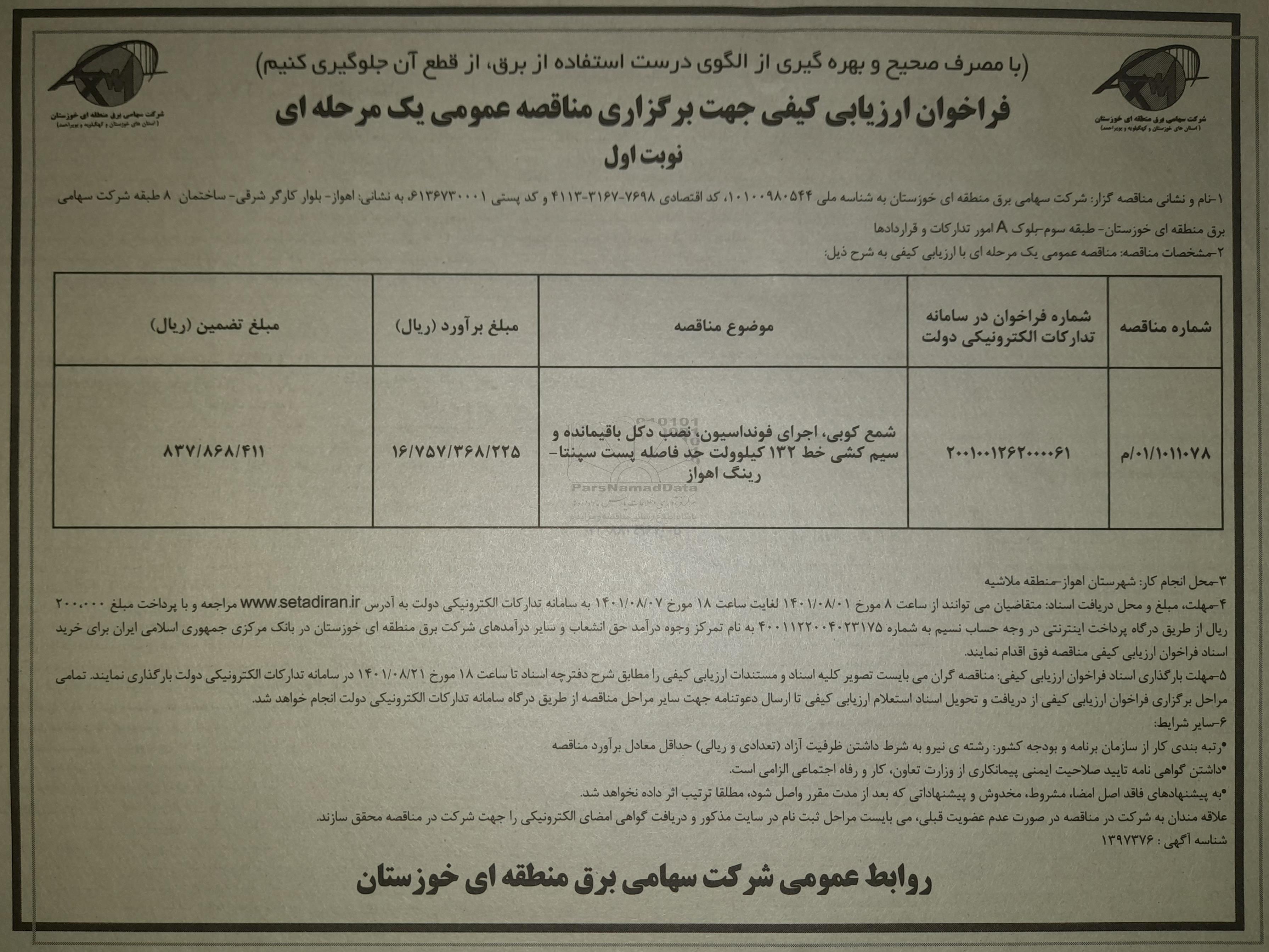 | 1011083/ 01/م | 2001001262000061 | شمع کوبی، اجرای فونداسیون، نصب دکل باقیمانده و سیم کشی خط 132 کیلوولت حد فاصله پست سپنتا - رینگ اهواز | 16.757.368.225 | 837.868.411 |