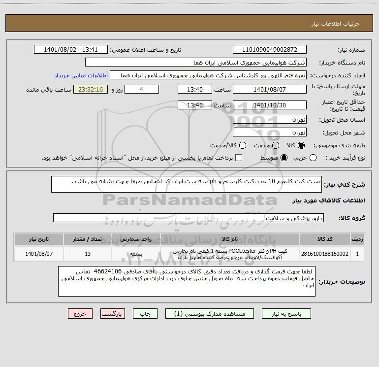 شرح کلی نیاز: تست کیت کلیفرم 10 عدد،کیت کلرسنج و ph سه ست،ایران کد انتخابی صرفا جهت تشابه می باشد.