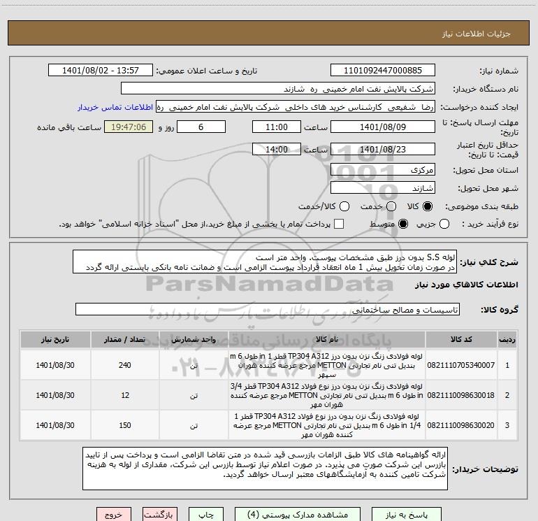 | 1 | 0821110705340007 | لوله فولادی زنگ نزن بدون درز TP304 A312 قطر 1 in طول 6 m بندیل تنی نام تجارتی METTON مرجع عرضه کننده هوران سپهر | تن | 240 | 1401/08/30 |