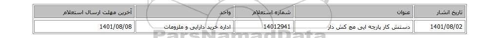 | 1401/08/02 | دستش کار پارچه ایی مچ کش دار | 14012941 | اداره خرید دارایی و ملزومات | 1401/08/08 |