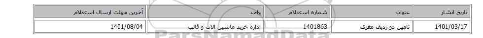 | 1401/03/17 | تامین دو ردیف مغزی | 1401863 | اداره خرید ماشین الات و قالب | 1401/08/04 |