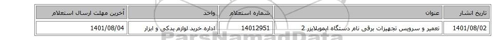 | 1401/08/02 | تعمیر و سرویس تجهیزات برقی نام دستگاه ایموبلایزر 2 | 14012951 | اداره خرید لوازم یدکی و ابزار | 1401/08/04 |