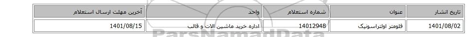 | 1401/08/02 | فلومتر اولتراسونیک | 14012948 | اداره خرید ماشین الات و قالب | 1401/08/15 |