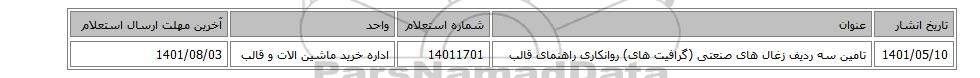 1401/05/10تامین سه ردیف زغال های صنعتی (گرافیت های) ‎روانکاری راهنمای قالب‏14011701اداره خرید ماشین الات و قالب1401/08/03