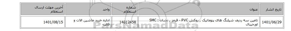 | 1401/06/29 | تامین سه ردیف شیلنگ های پنوماتیک , روکش PVC - قرمز , نشان : SMC اورجینال | 14012458 | اداره خرید ماشین الات و قالب | 1401/08/15 |