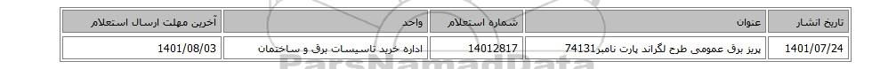 1401/07/24پریز برق عمومی طرح لگراند پارت نامبر7413114012817اداره خرید تاسیسات برق و ساختمان1401/08/03