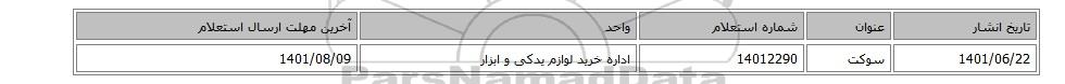 | 1401/06/22 | سوکت | 14012290 | اداره خرید لوازم یدکی و ابزار | 1401/08/09 |