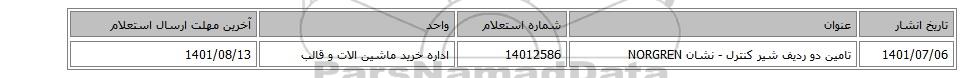 1401/07/06تامین دو ردیف شیر کنترل - نشان NORGREN14012586اداره خرید ماشین الات و قالب1401/08/13