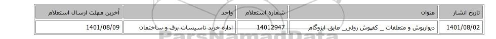 استعلام بها و موضوع استعلام دیوارپوش و متعلقات _ کفپوش رولی_ عایق ایزوگام به اطلاع کلیه شرکتها و افراد متخصص واجد شرایط میرساند، آگهی گذار در نظر دارد از طریق استعلام بها، نسبت به انتخاب و دریافت پیشنهادات اقدام نماید. این استعلام با کد آگهی ثبت شده در سامانه خبرگزاری پارس نماد : 5066280 منتشر شده است. مشخصات استعلام : تاریخ شروع استعلام: 1401/08/03 آخرین مهلت ارسال پیشنهاد قیمت : 1401/08/09 و محل اجرای پروژه : استان تهران میباشد. استعلام قیمت مورد درخواست : دیوارپوش و متعلقات _ کفپوش رولی_ عایق ایزوگام با دستهبندیهای تخصصی و گروه های مرتبط : انواع کفپوش, انواع عایق های رطوبتی ،حرارتی ،صوتی, دکوراسیون داخلی, مصنوعات چوبی و مبلمان اداری, استعلام اطلاع رسانی میگردد.