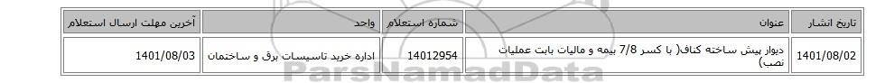 | 1401/08/02 | دیوار پیش ساخته کناف( با کسر 7/8 بیمه و مالیات بابت عملیات نصب) | 14012954 | اداره خرید تاسیسات برق و ساختمان | 1401/08/03 |