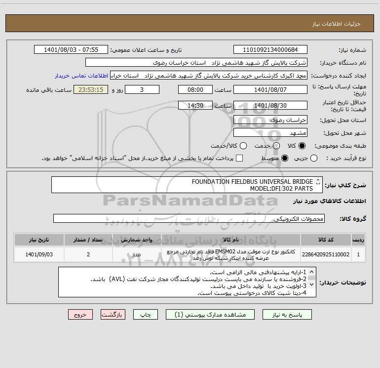 نام دستگاه خریدار:شرکت پالایش گاز شهید هاشمی نژاد استان خراسان رضوی