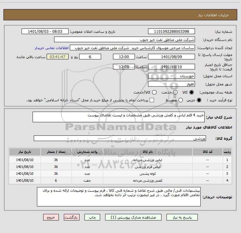 شرح کلی نیاز: خرید 4 قلم لباس و کفش ورزشی طبق مشخصات و لیست تقاضای پیوست
