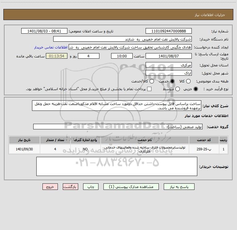 شرح کلی نیاز: ساخت براساس فایل پیوست-داشتن حداقل دومورد ساخت مشابه اقلام مذکورباصنعت نفت-هزینه حمل ونقل برعهده فروشنده می باشد.