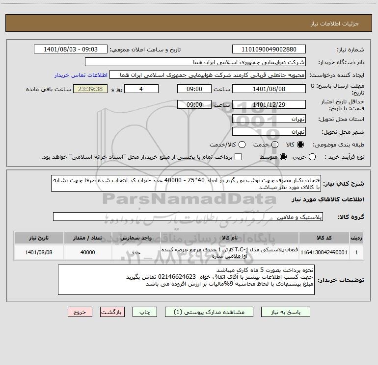شرح کلی نیاز: فنجان یکبار مصرف جهت نوشیدنی گرم در ابعاد 40*75 - 40000 عدد -ایران کد انتخاب شده صرفا جهت تشابه با کالای مورد نظر میباشد