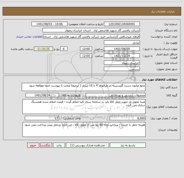 نام دستگاه خریدار:شرکت پالایش گاز شهید هاشمی نژاد استان خراسان رضوی