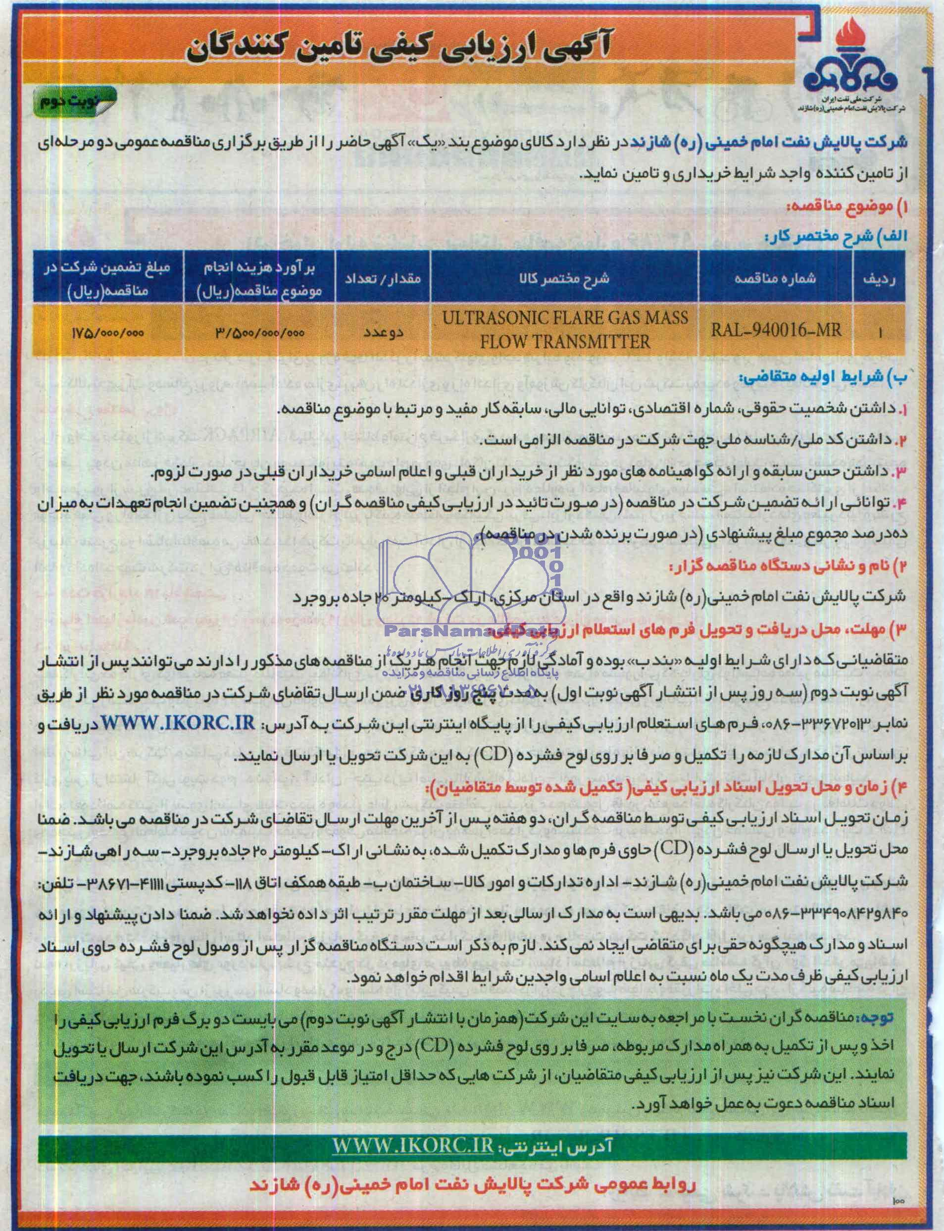 | RAL-940016-MR | ULTRASONIC FLARE GAS MASS FLOW TRAMSMITTER | دو عدد | 3.500.000.000 | 175.000.000 |