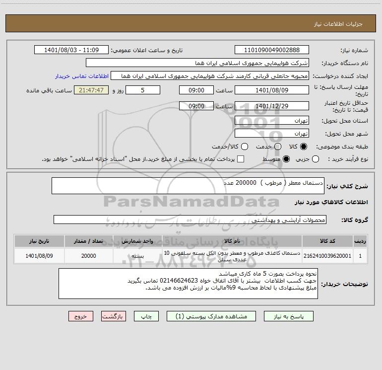 شرح کلی نیاز: دستمال معطر ( مرطوب ) 200000 عدد