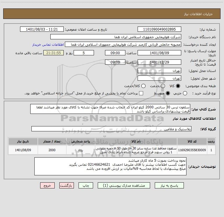 شرح کلی نیاز: سلفون ترس 30 سانتی 2000 کیلو ایران کد انتخاب شده صرفا جهت تشابه با کالای مورد نظر میباشد لطفا قیمت پیشنهادی براساس کیلو باشد