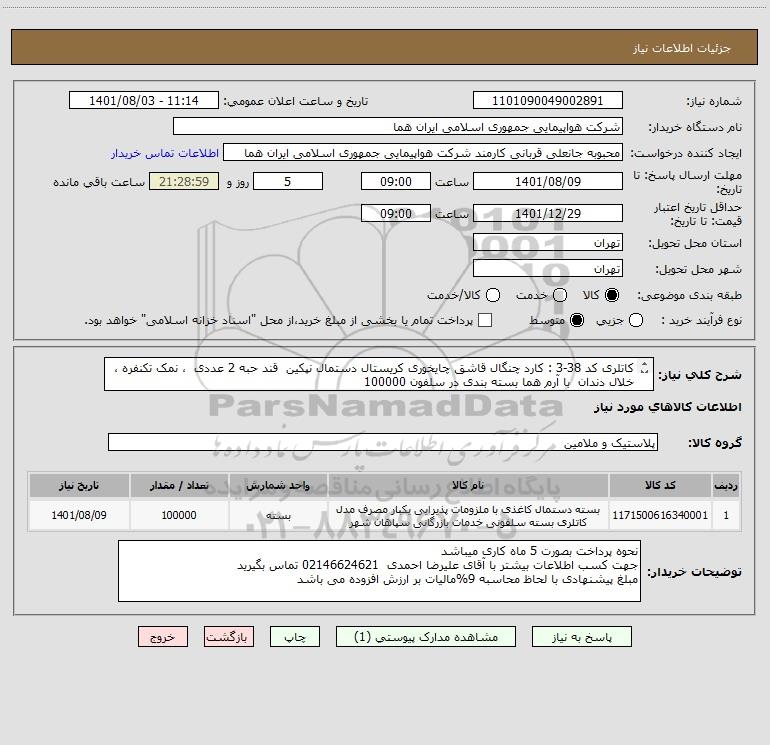شرح کلی نیاز: کاتلری کد 38-3 : کارد چنگال قاشق چایخوری کریستال دستمال نپکین قند حبه 2 عددی ، نمک تکنفره ، خلال دندان با آرم هما بسته بندی در سلفون 100000