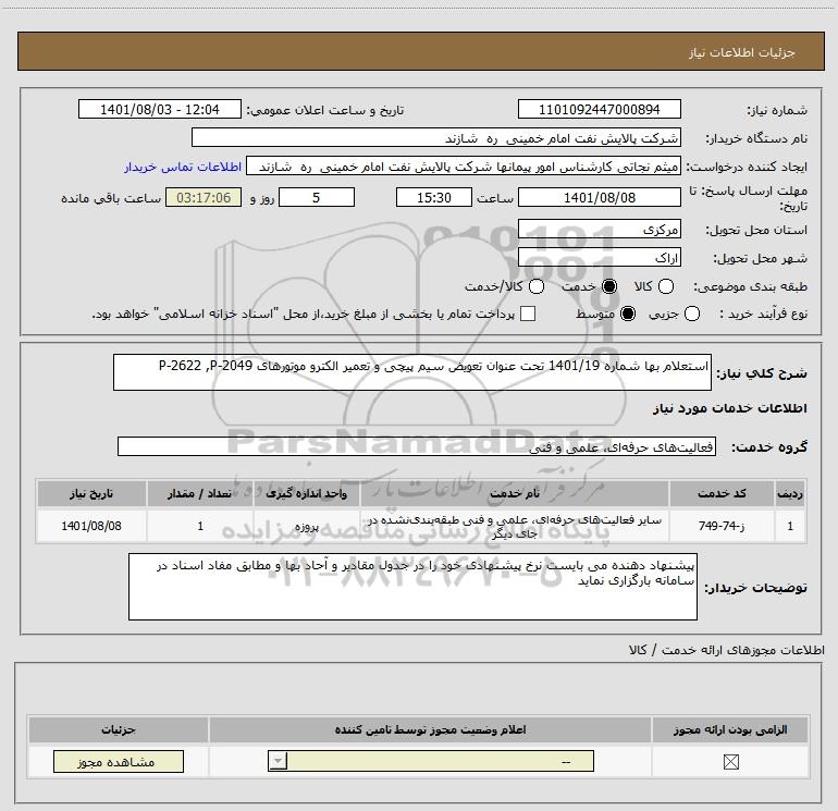 شرح کلی نیاز: استعلام بها شماره 1401/19 تحت عنوان تعویض سیم پیچی و تعمیر الکترو موتورهای P-2622 ,P-2049