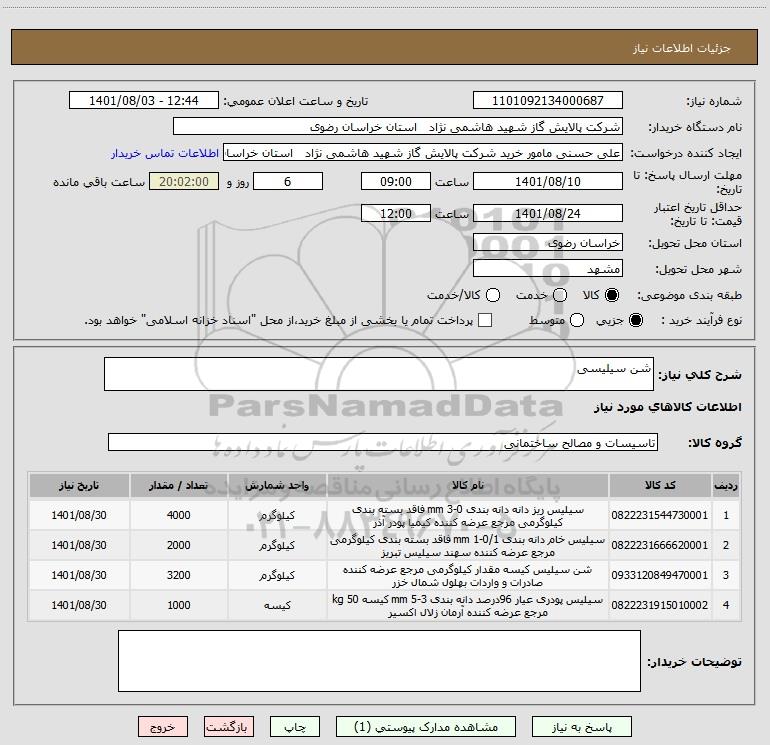 | 3 | 0933120849470001 | شن سیلیس کیسه مقدار کیلوگرمی مرجع عرضه کننده صادرات و واردات بهلول شمال خزر | کیلوگرم | 3200 | 1401/08/30 |