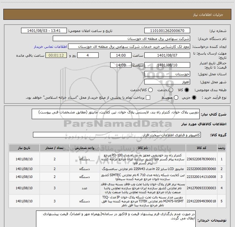 شرح کلی نیاز: دوربین پلاک خوان، کنترلر راه بند، لایسنس پلاک خوان، تین کلاینت، مانیتور (مطابق مشخصات فنی پیوست)