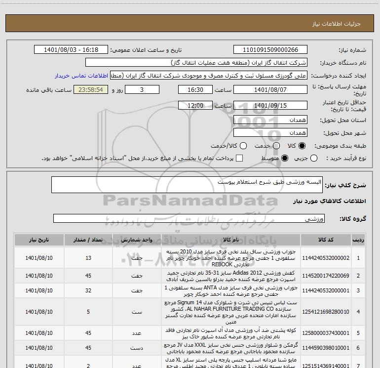 شرح کلی نیاز: البسه ورزشی طبق شرح استعلام پیوست