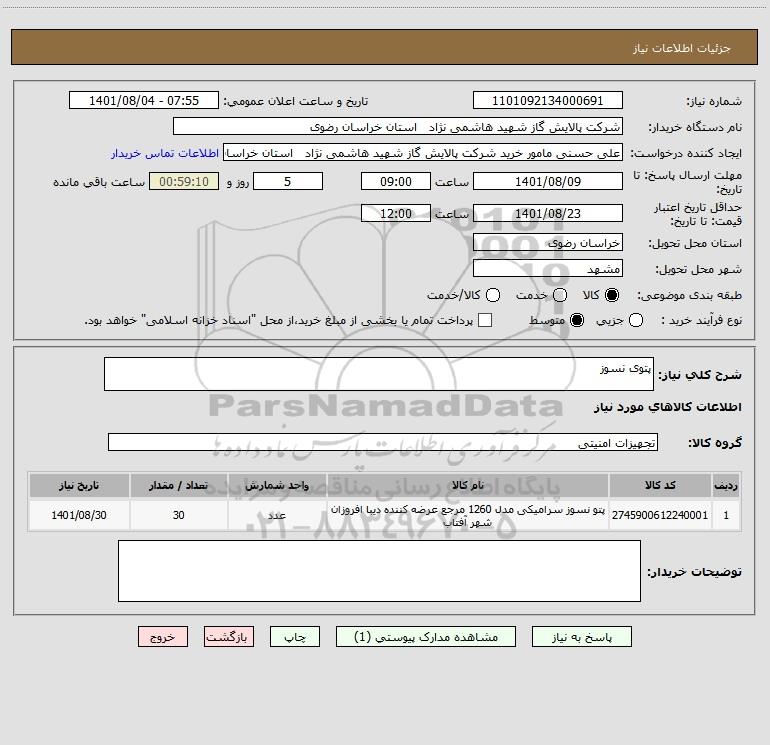 نام دستگاه خریدار:شرکت پالایش گاز شهید هاشمی نژاد استان خراسان رضوی
