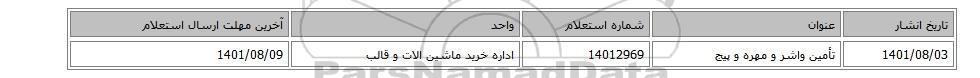 | 1401/08/03 | تأمین واشر و مهره و پیج | 14012969 | اداره خرید ماشین الات و قالب | 1401/08/09 |