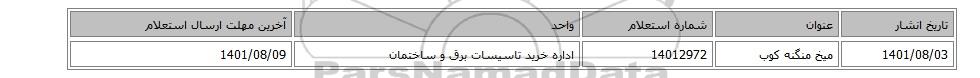 1401/08/03میخ منگنه کوب14012972اداره خرید تاسیسات برق و ساختمان1401/08/09