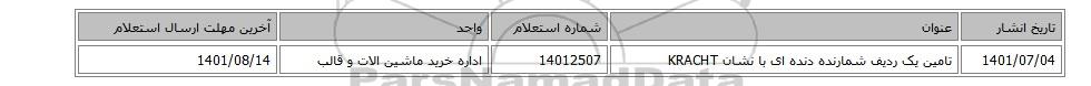 | 1401/07/04 | تامین یک ردیف شمارنده دنده ای با نشان KRACHT | 14012507 | اداره خرید ماشین الات و قالب | 1401/08/14 |
