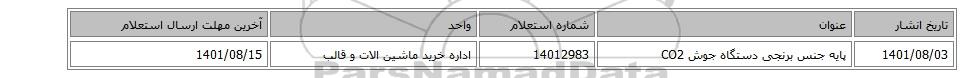 | 1401/08/03 | پایه جنس برنجی دستگاه جوش CO2 | 14012983 | اداره خرید ماشین الات و قالب | 1401/08/15 |