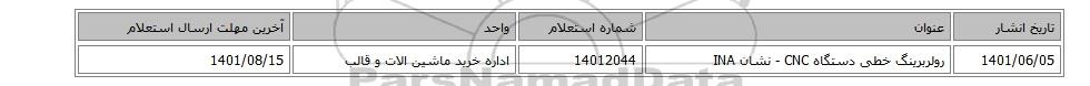 | 1401/06/05 | رولربرینگ خطی دستگاه CNC - نشان INA | 14012044 | اداره خرید ماشین الات و قالب | 1401/08/15 |