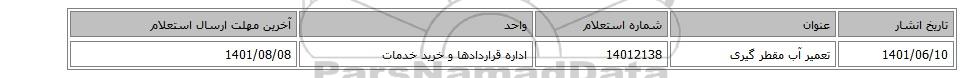 | 1401/06/10 | تعمیر آب مقطر گیری | 14012138 | اداره قراردادها و خرید خدمات | 1401/08/08 |