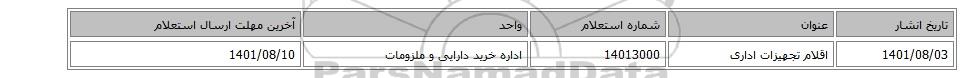 | 1401/08/03 | اقلام تجهیزات اداری | 14013000 | اداره خرید دارایی و ملزومات | 1401/08/10 |