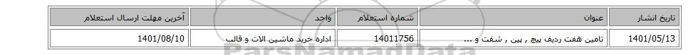 | 1401/05/13 | تامین هفت ردیف پیچ , پین , شفت و ... | 14011756 | اداره خرید ماشین الات و قالب | 1401/08/10 |