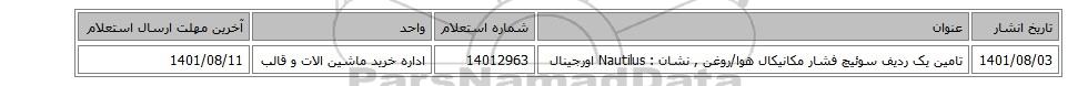| 1401/08/03 | تامین یک ردیف سوئیچ فشار مکانیکال هوا/روغن , نشان : Nautilus اورجینال | 14012963 | اداره خرید ماشین الات و قالب | 1401/08/11 |
