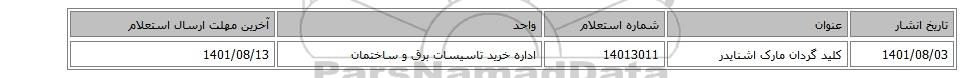 | 1401/08/03 | کلید گردان مارک اشنایدر | 14013011 | اداره خرید تاسیسات برق و ساختمان | 1401/08/13 |