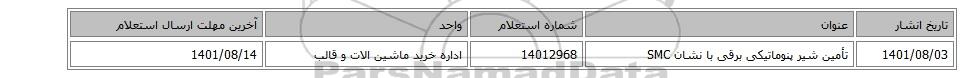 | 1401/08/03 | تأمین شیر پنوماتیکی برقی با نشان SMC | 14012968 | اداره خرید ماشین الات و قالب | 1401/08/14 |
