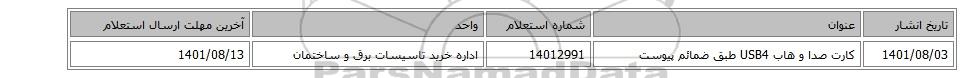 | 1401/08/03 | کارت صدا و هاب USB4 طبق ضمائم پیوست | 14012991 | اداره خرید تاسیسات برق و ساختمان | 1401/08/13 |