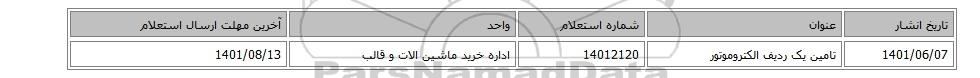 | 1401/06/07 | تامین یک ردیف الکتروموتور | 14012120 | اداره خرید ماشین الات و قالب | 1401/08/13 |